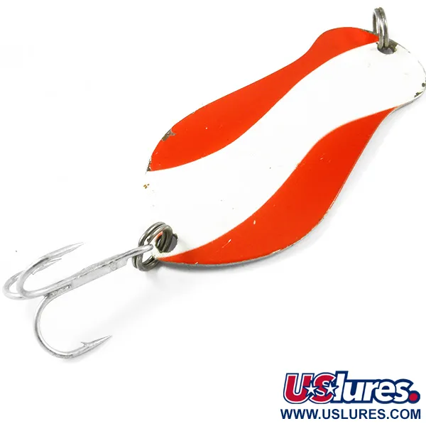 Polerad nickel på baksidan har en tydlig stämpel som identifierar detta som ett exemplar av K-B Amasa, Mich. storlek 2. Med en längd på 6,5 cm (2 1/2") och en vikt på 14 g (1/2 oz) är K-B Spoon 2 en robust del av Michigans fiskehistoria, ofta omnämnd av amerikanska sportfiskare som ett bete för riktigt stor fisk. Den konvexa framsidan är dekorerad med ett klassiskt röd-vitt vågigt mönster över en ren vit bas, ett högvisuellt färgschema avsett för gädda och muskie under varierande vattenförhållanden. Under produktkod 3263 behåller detta skeddrag sin ursprungliga hårdvara, inklusive två robusta fjäderringar och en vass, silverfärgad trekrok. Detta specifika föremål är i utmärkt skick och får betyget 5/5 för sin välbevarade färg och reflekterande metallfinish. Tillverkad av K-B Bait Co. i USA, är den solida konstruktionen lämplig för både kast och trolling. Den stämplade tvåan på baksidan motsvarar den storleksklassificering som användes av Amasa-verkstaden under dess produktionsår.