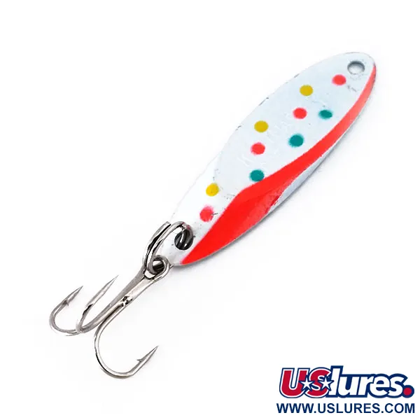 Flerfärgade prickar i gult, blått och rött sticker ut mot den vitmålade ytan på detta 1/4oz (7g) skeddrag, ett kännetecken för Acmes sortiment från USA. Draget mäter 1 3/4" (4,5 cm) och framsidan är detaljerad med en tydlig röd rand, medan baksidan har en polerad nickelfinish. Detta specifika exemplar, med produktkod 10354, är tillverkat av en speciallegering som säkerställer exakt balans vid kast eller vertikalfiske på djupt vatten. Komponenterna består av en robust fjäderring tillsammans med en vass trekrok, lämplig för användning i både stillastående vatten och starka strömmar. Skicket på betet är 5/5, och det behåller ett rent och livfullt utseende i färgkombinationen Trout / Nickel. Sportfiskare använder vanligtvis denna vikt och profil för att fiska efter en mängd olika rovfiskar under olika årstider.
