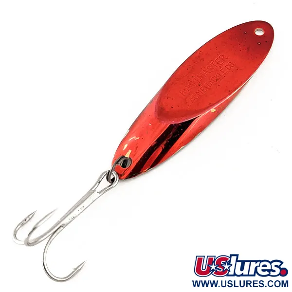 En slående tvåfärgad finish i rött och guld definierar detta specifika 1oz (28g) Acme skeddrag. Ovansidan har en levande röd beläggning med den ikoniska "KASTMASTER ACME LURE"-stämpeln tydligt synlig i metallen, medan baksidan avslöjar en polerad yta i guld-mässing. Med en längd på 2 3/4" (7cm) är den tunga, aerodynamiska profilen på denna 11236-modell designad för långdistanskast och djupt vatten. Draget är utrustat med en ren, silverfinishad trekrok fäst med en robust fjäderring. Acmes val av en specifik legering för sina USA-tillverkade modeller säkerställer att balansen förblir exakt, en detalj som skiljer originalexemplar från standardkopior. Detta specifika drag är i utmärkt 5/5 skick, med en mycket välbevarad finish och vassa krokspetsar. Den kompakta konstruktionen gör det till ett effektivt val för sportfiskare som riktar sig mot rovfiskar i starka strömmar där det är nödvändigt att hålla djupet.