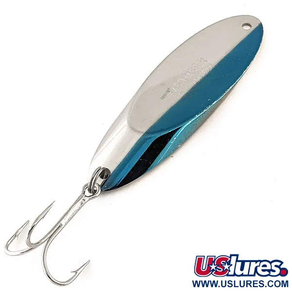 Med sina 56 g (2 oz) levererar detta massiva skeddrag den tyngd som krävs för att nå djuphålor eller kasta i hård vind. Betet mäter 8,5 cm (3 1/4") och har en slående tvåtonad estetik med ett klarblått blänk bredvid den polerade silverytan. Denna äkta Acme Kastmaster, produktkod 12137, är tillverkad i USA och bär tillverkarens stämpel tydligt på framsidan. Dess specifika kilformade design bygger på en specialiserad legering för att bibehålla balansen under sjunkfasen och hemtagningen. Komponenterna består av en kraftig fjäderring och en stor trekrok utformad för stora rovfiskar. Skicket är för närvarande 5/5 och den reflekterande ytan är exceptionellt ren. Mångsidigheten gör det lämpligt för jiggfiske eller trolling genom olika vattenlager.