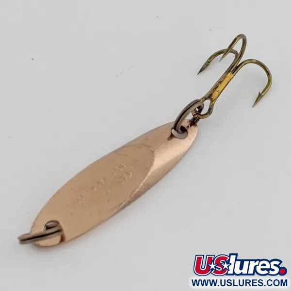 En varm kopparfärg täcker ytan på detta lilla skeddrag i metall på 2,5 g (3/32 oz), vilket ger ett subtilt blänk jämfört med kromade ytbehandlingar. Dragt är 3 cm (1 1/4") långt och har den karakteristiska snedskurna profil som Acme tagit fram för balans och långa kast. Framsidan är tydligt stämplad med "KASTMASTER ACME TACKLE CO". Kopparfinish föredras ofta vid fiske i grumligt vatten eller på mulna dagar när en mjukare reflektion krävs. En original trekrok i bronston är monterad baktill, och draget är i utmärkt skick (betyg 5/5). Den aerodynamiska formen gör det effektivt för olika tekniker, från vertikalt jiggfiske till jämn hemtagning i strömmande vatten. Produktkod 24511.