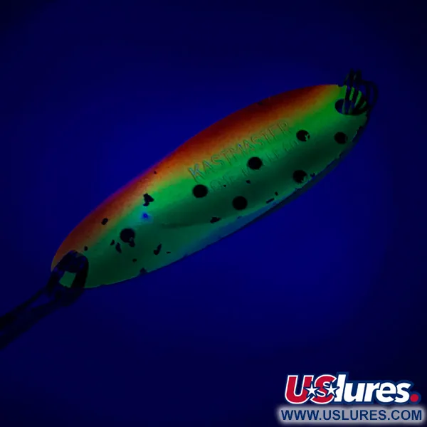 Tung nog för långdistanskast med sina 3/4 oz (21 g), ger det distinkta snedskurna snittet på detta Acme skeddrag en profil som sportfiskare har förlitat sig på i generationer. Detta specifika exemplar, med produktkod 6054, mäter 2 1/2" (6,2 cm) och har ett vackert bevarat Regnbåge-färgschema. Färgövergången går från en klar orange kant till en solgul mitt och avslutas med en levande grön färg, toppad med precisionsplacerade svarta prickar. På baksidan är den högreflekterande nickelytan ren och blank. Inpräglat i metallytan finns orden "KASTMASTER ACME TACKLE CO.", vilket identifierar dess ursprung från USA och dess tekniska arv. Den strukturella integriteten är exceptionell med betyget 5/5, och visar välskötta fjäderringar och en vass trekrok. Dess balanserade legering är specifikt konstruerad för stabilitet vid vertikalfiske eller vid invevning i starka strömmar.