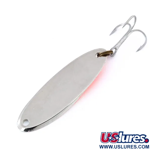 Med sin vikt på 1/2 oz (14 g) är detta skeddrag perfekt balanserat för att nå de djup där stora rovfiskar jagar. Acme Kastmaster Glow, med produktkod 10495, har en slående tvådelad färgsättning över sin 2 1/4" (5,7 cm) långa kropp. Ena halvan av ytan är målad i livlig orange med en enstaka rosa prick, medan den andra halvan är täckt av en specialiserad självlysande krämvit färg. Som den andra bilden visar ger denna krämvita sektion ett starkt grönt sken när den laddas, vilket skapar en visuell attraktionspunkt i mörka vatten eller på stora djup. Betets baksida är i polerad nickel, vilket ger ett klassiskt metalliskt blänk. Detta exemplar är i 4/5 skick och uppvisar välbevarad färg samt originalkomponenter, inklusive pålitliga fjäderringar och en silverfärgad trekrok. Betets distinkta avsmalnande form gör att det bibehåller sin gång effektivt även i stark ström.