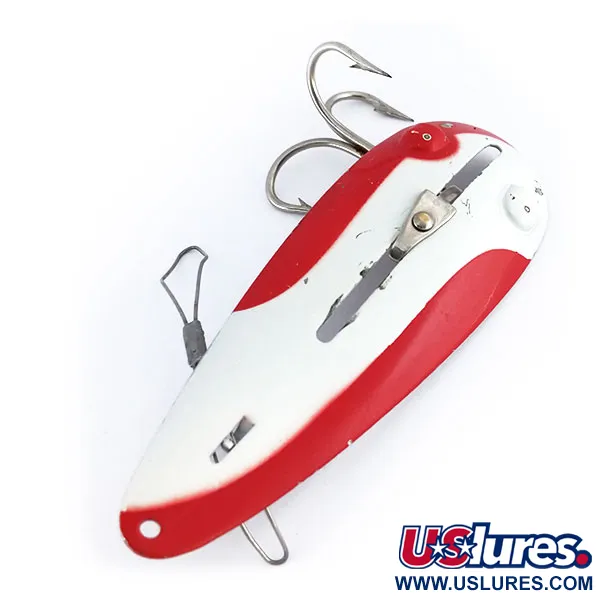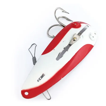 Ett iögonfallande rött och vitt färgschema täcker ovansidan av detta 25g (1oz) Katch King skeddrag, som härstammar från 1958. Ursprungligen från USA under produktkod 9948, har den 9cm (3 1/2") långa kroppen en polerad nickelundersida. Detta exemplar utmärker sig för sin omställbara konstruktion; glidmekanismen på ovansidan gör det möjligt för sportfiskaren att aktivera ett vass-skydd, vilket anpassar betet för kast genom vegetation eller i öppet vatten. Finishen är exceptionellt välbevarad och har fått betyget 5/5 i skick med livfulla färger och rena metallytor. Hårdvarukonfigurationen inkluderar en bakre trekrok och ett internt vass-skyddssystem integrerat i den konkava ramen.