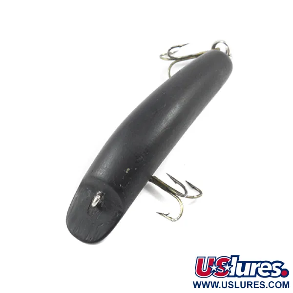 Svart färg täcker hela denna 3" (7,5 cm) balsa-kropp, vilket ger denna Kautzky Lazy Ike ett diskret utseende med hög kontrast. Med en vikt på 1/4oz (7,5 g) bär detta exemplar produktkod 1925 och förblir ett definitivt exempel på amerikanskt hantverk från mitten av århundradet. Balsa-konstruktionen ger betydande flytkraft, parat med den ikoniska böjda profilen som ursprungligen utvecklades i Fort Dodge, Iowa. Vid granskning av hårdvaran är de två trekrokarna monterade via robusta skruvöglor, medan linfästet är placerat direkt på den utskurna hakskeden framtill. Detta bete är i 5/5-skick och uppvisar en anmärkningsvärt slät och enhetlig finish från det rundade huvudet till den avsmalnande stjärten. Det djupsvarta pigmentet förblir solitt över de utskurna ansiktsdragen och längs hela kroppen.
