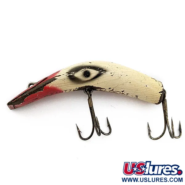 En karakteristiskt böjd kropp utmärker silhuetten på detta 7 cm (2 3/4") långa träbete, ett skolexempel på amerikanskt hantverk från mitten av seklet. Med en vikt på 9 g (1/3 oz) bär Kautzky Lazy Ike 3 produktkod 20123 och har en gräddvit kropp med en markerad röd front och stora, målade bullseye-ögon. Ytan uppvisar ett karaktärsfullt nätverk av fina krackeleringar i lacken och ett betydande färgslitage efter flitig användning, vilket ger ett skickbetyg på 3 av 5. Centrerat längs sidan identifierar den ursprungliga fabriksstämpeln tydligt dess ursprung och modellnummer. Två bukmoterade trekrokar visar kraftig oxidering och åldrande, vilket speglar den långa historien hos detta bete tillverkat i Iowa.