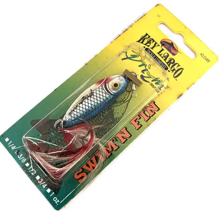 Ljusblå regnbågsfiskfjäll skimrar över den 4,5 cm (1 3/4") långa kroppen på denna Key Largo Swim'n Fin, en vintage metalljigg med tillverkarens signatur Prizm Image holografiska finish. Med en vikt på 11 g (2/5 oz) monterades detta specifika exemplar, identifierat med produktkod 11290, i Dominikanska republiken med amerikanska komponenter. Designen inkluderar ett realistiskt gjutet 3D-öga och en robust crane-lekare fäst vid nosen för säker linanslutning. Baktill ger en handbunden fjäderbeklädd saltvattens-trekrok en touch av karmosinrött till den silver- och blåfärgade profilen. Som en oanvänd artikel i sin originalblisterförpackning är betet i nyskick. Detta varumärke baserat i Ft. Myers, Florida, konstruerade specifikt Swim'n Fin med en strömlinjeformad profil för att efterlikna små betesfiskar genom olika kast- eller vertikaljiggningstekniker.