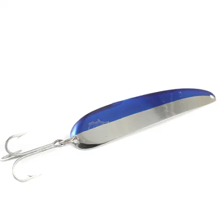 Färgsättningen Nickel / Blue delar ytan på detta slanka skeddrag för trolling, vilket skapar en tydlig visuell kontrast mellan den polerade metallen och det djupblå pigmentet. På den konkava sidan står det tydligt stämplat "KING FLUTTER DEVLE DETROIT USA 3200", vilket identifierar dess ursprung från Eppingers verkstad i Michigan. Skeddraget mäter 10 cm (4") och väger 9 g (1/3 oz), och dess tunna konstruktion är specialbyggd för trolling snarare än tungt spinnfiske. Detta exemplar, listat under produktkod 1592, är i utmärkt skick och får betyget 5/5 för sin ljusa, spegelblanka nickelfinish och djupblå ovansida. En silverfärgad trekrok är fäst vid stjärten via en fjäderring, vilket bibehåller den ursprungliga profilen på detta amerikansktillverkade drag.