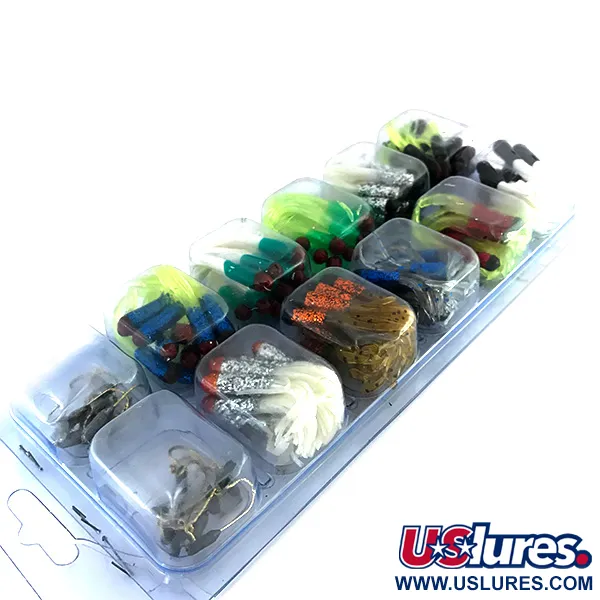 Denna fabriksförseglade box är uppdelad i tio olika fack och innehåller ett omfattande urval av 2-tums (5 cm) mjuka jiggar med kjolar i octopus-stil. Sortimentet har en varierad färgpalett med blå, röd, gul, grön, silver, guld, svart och brun. Fem specifika fack innehåller UV-reaktiva beten, utformade för att öka synligheten under svaga ljusförhållanden eller i djupare vattenlager. Tillverkat i USA av Creme, är kitet specifikt konfigurerat för jiggfiske. Varje fack innehåller 10 individuella Maxi Tails, vilket ger totalt 100 jiggar tillsammans med 19 sorterade jigghuvuden placerade i brickans övre sektioner. Setet identifieras med produktkod 8368 och innehåller både solida högkontrastfärger och alternativ med fint glitter för extra reflektion. Som en oanvänd artikel i originalförpackning får detta exemplar ett skickbetyg på 6.