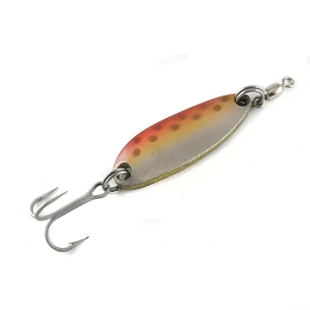 Tillverkarens märke är tydligt stansat i mässingsbaksidan och identifierar denna Luhr Jensen Krocodile som ett måste för den som jagar rovfisk. Skeddraget är 1 1/2" (3,5 cm) långt och har ett öringmönster på framsidan, kännetecknat av en mjuk grå-guldig bas, fina röda och bruna prickar samt en subtil orange accent längs överkanten. Med en vikt på 3/16 oz (6 g) är den kraftiga metallen utformad för kastprecision och för att nå önskat djup vid invevning eller trolling. Komponenterna är i utmärkt skick, inklusive silverfinishade fjäderringar, en trekrok och en lekare vid huvudet för linhämtning. Detta exemplar, med produktkod 1065, är i 5/5 skick och har en högblank mässingsfinish på baksidan som framhäver den skarpa texten "KROCODILE" och "LUHR JENSEN".