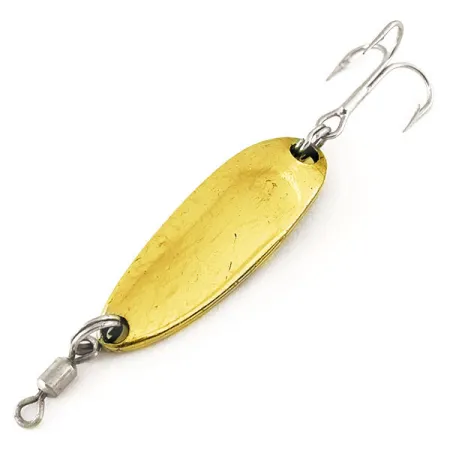 Genom att stämpla varumärket direkt i metallen identifierar Luhr Jensen detta 1 1/2" (3.5 cm) skeddrag som den ikoniska "KROCODILE"-modellen. Guldytan på detta 1/4 oz (7 g) bete ger en hög synlighetsprofil, idealisk för att skära genom grumligt vatten eller fånga djupt trängande solljus. Med produktkod 12315 har konstruktionen en smal kropp i tjockt gods, designad för överlägsna kastlängder och snabb sjunkhastighet. På hårdvarusidan är en lekare förmonterad på nosens fjäderring för att förhindra linvridning, medan en silverfinishad trekrok sitter vid stjärten. Skicket på detta exemplar är 5/5, med en ren, reflekterande yta och skarp, läsbar stämpling på den konvexa sidan. Sportfiskare använder ofta denna specifika vikt och form för både spinnfiske och trolling i olika söt- och saltvattenmiljöer. Fjäderringsfästena säkerställer att hårdvaran bibehåller full rörelsefrihet under hemtagningen.