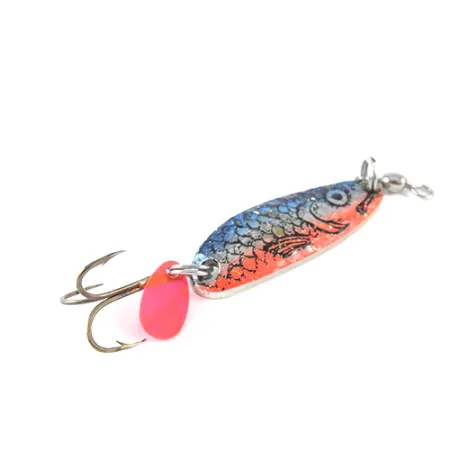 Ett klassiskt abborrmönster med nyanser av djupt blått och eldigt orange pryder framsidan av detta 4 cm (1 1/2") Luhr Jensen skeddrag. Med en vikt på 9 g (1/3 oz) är detta metallbete byggt för de långdistanskast som krävs för att nå fisk i djupare vatten. Baksidan av den tjocka kroppen är polerad till en hög silverglans, tydligt stämplad med tillverkarens namn och Krocodile-märket, vilket indikerar dess ursprung i USA. En liten, lysande rosa plastfena är fäst vid den bakre fjäderringen tillsammans med trekroken för att fungera som en extra visuell trigger. För samlare identifieras denna specifika artikel med produktkod 1688. Ytfinish och komponenter är i oklanderligt skick, vilket gör den till en tydlig 5/5 för en vintage-utställning. Dess smalare profil och tyngdpunkt utformades specifikt av Luhr Jensen för att hjälpa betet skära genom vattnet och snabbt nå önskat djup.