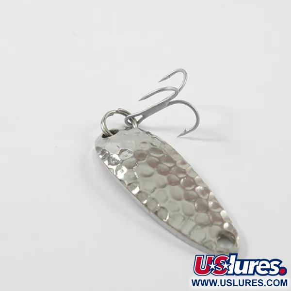 En rejäl vikt på 1/4oz (7g) koncentrerad i en 1 1/2" (4cm) kropp gör denna Luhr Jensen Krocodile till ett utmärkt val för att nå mål på djupt vatten. Ena sidan av betet har en texturerad Hammered Nickel-finish designad för att fånga och reflektera ljus, medan baksidan är blankpolerad och bär den tydligt stämplade tillverkarmärkningen « LUHR JENSEN KROCODILE ». Identifierad med produktkod 2682, är detta skeddrag märkbart tjockare än standardbeten, vilket underlättar långdistanskast även i hård vind. Maskinvaran består av en robust fjäderring och en ren trekrok, båda välbevarade. Detta vintage-exemplar är i 5/5-skick och behåller en ljus, ren lyster över hela ytan. Betets tunga profil är särskilt lämpad för sportfiskare som behöver få ner sin presentation snabbt i strömmande vatten eller djupa sjöbassänger.