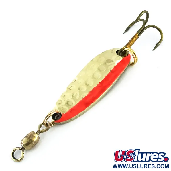 En hamrad guldtextur ger detta 3,5 cm (1 1/2") skeddrag en mångfacetterad yta som effektivt fångar ljuset under vattenytan. Denna specifika Luhr Jensen Krocodile, med produktkod 8961, väger 7 g (1/4 oz), vilket gör den till ett mångsidigt val för både sötvattensfiske och lättare saltvattensfiske. Framsidan kännetecknas av sin hamrade metallfinish med en markerad orange längsgående rand, medan baksidan har en slät guldyta tydligt stämplad med tillverkarens namn och modell. Krocodile är känd bland erfarna sportfiskare för sin karaktäristiska vaggande gång, och den smala droppformen är byggd för långkastande och jämn invevning. Detta exemplar är i utmärkt skick, graderat 5/5, utan tecken på slitage på den målade randen eller metallpläteringen. Komponenterna är robusta, med ett lekande i mässing vid nosen och en vass trekrok fäst med en kraftig fjäderring. Det är ett fint exempel på det hantverk som gjort Luhr Jensen till en klassiker i fiskelådor under årtionden.