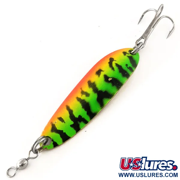 Tydligt instämplat på den mässingsfärgade undersidan är ursprunget Hood River, Oregon, ett signum för dessa klassiska Luhr Jensen skeddrag. Denna Krocodile Die #3, identifierad med produktkod 11367, väger 1/3 oz (10 g) och mäter 2 1/4" (5,5 cm) i längd. Ovansidan har ett intensivt Fire Tiger-mönster med en lysande orange rygg som övergår via gult till chartreuse-grönt, toppat med tjocka svarta vertikala ränder. Med skicket 5/5 är metallytorna och originaldetaljerna anmärkningsvärt rena och blanka. Denna tjockare och smalare design är byggd specifikt för att nå stora kastavstånd och ger en tydlig vaggande gång vid jämn invevning som imiterar ett levande bete. Ett robust lekande är fäst vid den främre fjäderringen för att minska linvridning, medan stjärten håller en stark trekrok.