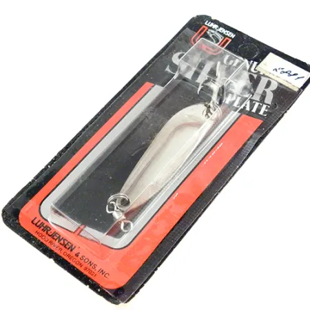 Äkta silverplätering ger en reflekterande lyster som utnyttjar silvrets molekylära struktur för att blänka djupare i vattenpelaren än alternativ i nickel eller krom. Denna Luhr Jensen Krocodile Die #3, med produktkod 2881, väger 1/4 oz (7 g) och har den signaturlika smala profilen designad för långdistanskast. Skeddraget är 2 1/4" (5,7 cm) långt och fabriksmonterat med en lekare i fronten och en vass trekrok. Tillverkad av Luhr Jensen & Sons, Inc. i Hood River, Oregon, är produkten oanvänd i sin originalförpackning. Baksidan av kortet innehåller ett praktiskt diagram för att knyta en förbättrad clinch-knut tillsammans med teknisk information om ytbehandlingen. Skicket är graderat till 6, eftersom draget är bevarat i sin fabriksförseglade originalförpackning.