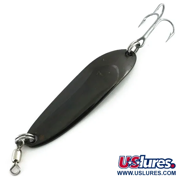 Stämplingen på den inre konvexa sidan markerar detta som en äkta Luhr Jensen-produkt från fabriken i Hood River, Oregon. Med en längd på 5,5 cm (2 1/4") har detta exemplar stämpeln 'Die #3' och en vikt på 10 g (1/3 oz), lämplig för både spinnfiske och trolling. Den solida svarta finishen ger en tydlig profil, vilket är ett taktiskt val för sportfiskare som fiskar i svagt ljus eller grumligt vatten. Detta vintage-fynd, produktkod 8775, är i oanvänt skick och har betyget 5/5. Fabriksmonterad utrustning inkluderar en silverfärgad trekrok säkrad med en fjäderring och en lekarek vid linögat för att motverka linvridning vid invevning. Den tunga, smala metallkroppen är konstruerad för extra långa kast samtidigt som den bibehåller en stadig simrörelse.