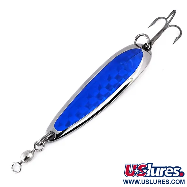 En livfull blå holografisk prismatejp täcker ovansidan av detta 19g (2/3oz) skeddrag, vilket ger en skarp kontrast mot den polerade nickelfinishen på baksidan. Tillverkad av Luhr Jensen i USA, detta exemplar är Krocodile Die #4, listad under produktkod 10296. Den 6,5 cm (2 1/2") långa kroppen är stämplad med det klassiska "KROCODILE" Die #4-märket, som anger tillverkarens plats i Hood River, Oregon. Utrustningen inkluderar en fabriksmonterad lekare i nosen och en robust trekrok säkrad med en kraftig fjäderring. Detta specifika Nickel / Blå färgmönster föredras ofta av sportfiskare som jagar lax eller öring i klart vatten där en djupgående vikt krävs. Ytorna och kroken är i utmärkt skick (5/5), med en ren och reflekterande lyster över metallen och tejpen. Varje stämpling är tydlig och djup, vilket återspeglar den höga tillverkningsstandarden i Luhr Jensens historiska produktion.