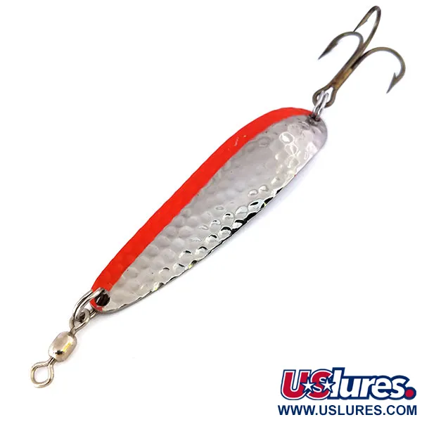 Hamrade nickelfinnishar ger den primära reflexen på denna 1/2 oz (14 g) Luhr Jensen Krocodile Die #4, en klassisk design som uppskattas för sin densitet och räckvidd i kasten. Skeddraget mäter 2 1/2" (6,5 cm), har produktkod 10625 och en livfull fluorescerande orange rand längs sidan. Detta orangea element är särskilt effektivt i svaga ljusförhållanden då det lyser starkt under UV-ljus, vilket gör det till ett givet val för laxfiskare i Great Lakes som fiskar från pirer eller längs djupa stränder. Den tjocka, smala kroppen är designad för att skära genom luften och nå distanser som andra skeddrag inte når. Utrustningen inkluderar ett toppmonterat lekande för att skydda din lina och en robust trekrok. Just detta exemplar är i 5/5 skick och behåller sin ursprungliga fabriksglans och skarpa färglinjer. Oavsett om du kastar i motvind eller trollar längs en djup brant, säkerställer viktfördelningen att den karaktäristiska vaggande gången förblir konsekvent.