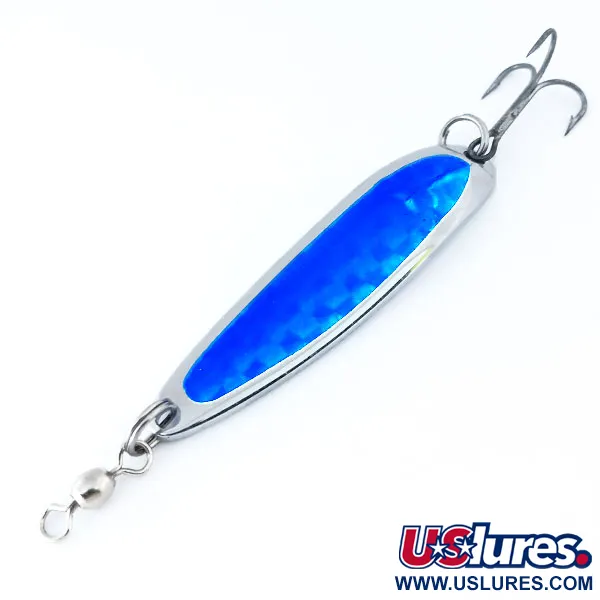 Detta tunga skeddrag, präglat med sitt ursprung från Hood River, Oregon, väger 17g (3/5oz). Ett slående blått fjällmönster är snyggt inlagt på framsidan av den förnicklade kroppen, som mäter 6,5cm (2 1/2"). Luhr Jensen designade Krocodile Die #4, identifierad med produktkod 10933, som ett kompakt verktyg med smal profil som når djupt vatten där lättare skedar inte tränger ner. Komponenterna är solida, med ett smidigt lekande och en stark original-trekrok fäst med kraftiga fjäderringar. Skicket på betet är exceptionellt välbevarat och får betyget 5/5, då det behåller sin ursprungliga fabriksglans och tydliga präglingar på metallens baksida.