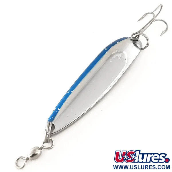 Tydligt stämplat på undersidan står "KROCODILE DIE #4" tillsammans med ursprunget Hood River, Oregon, ett kännetecken för Luhr Jensens historiska produktion. Detta specifika exemplar har ett klassiskt färgschema i Nickel / Blue, där en levande blå rand löper längs ytterkanten av den polerade nickelkroppen, med visst lätt, autentiskt slitage på den målade ytan. Med en vikt på 1/2 oz (14 g) och ett mått på 2 1/2" (6,5 cm), är skeddraget byggt med en tydlig tjocklek som hjälper det att nå betydande kastlängder. Komponenterna förblir robusta, med en kraftig fjäderring parad med en vass trekrok och ett högkvalitativt lekande vid huvudet för att minska linvridning. Med ett tillståndsbetyg på 5/5 behåller nickelytan en ljus, reflekterande kvalitet som gör den till en stapelvara för fiske efter lax eller öring. Krocodile används ofta för spinnfiske, trolling eller till och med vertikalfiske, och dess form gör att den bibehåller en stadig gång vid olika hastigheter. Varje detalj på detta bete är katalogiserat under produktkod 11868.