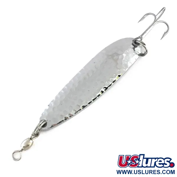 En yta av hamrad nickel ger Krocodile Die #4 en mångsidig yta som fångar ljuset från olika vinklar. Detta skeddrag från Luhr Jensen, med produktkod 8426, väger 19g (2/3oz) och är 6,5cm (2 1/2") långt. Betets baksida är stämplad med tillverkarens namn, modellen "KROCODILE" och ursprungsmärkningen "Hood River, Ore. Made in USA". Dess smala, viktade profil är utformad för långa kast mot djupare vatten och har en karakteristisk vaggande gång vid både spinnfiske och trolling. Hårdvaran består av en robust trekrok och ett lekande fäst med fjäderringar. Detta exemplar är i 5/5-skick och bibehåller en glänsande metallisk lyster på båda sidor med rena originalkomponenter.