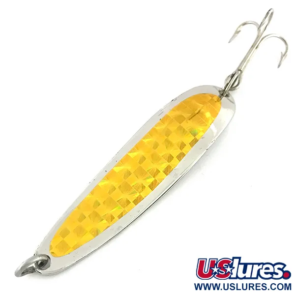 Krocodile Die #4 mäter 6,5 cm (2 1/2 tum) och har en distinkt gyllene prismatejp applicerad över en polerad nickelfinish. Detta skeddrag på 14 g (1/2 oz) från Luhr Jensen, med produktkod 8533, återspeglar det klassiska hantverket från Hood River, Oregon. Den smala kroppen med tjock profil är ett signum för Krocodile-designen, avsedd för långa kastavstånd eller för att hålla djupet vid trolling. På baksidan är metallen tydligt stämplad med tillverkarens namn och ort, vilket framhäver nickelbasens rena linjer. Monteringen består av en robust fjäderring och en vass trekrok, vilket visar på ursprunglig fabriksintegritet. Detta exemplar har betyget 5/5 och är i utmärkt skick, med bibehållen hög reflektionsförmåga och det holografiska mönstrets skarpa geometri. Kombinationen av den silverfärgade baksidan och den guldfärgade framsidan ger en mångsidig färgprofil för sportfiskare som jagar rovfisk.