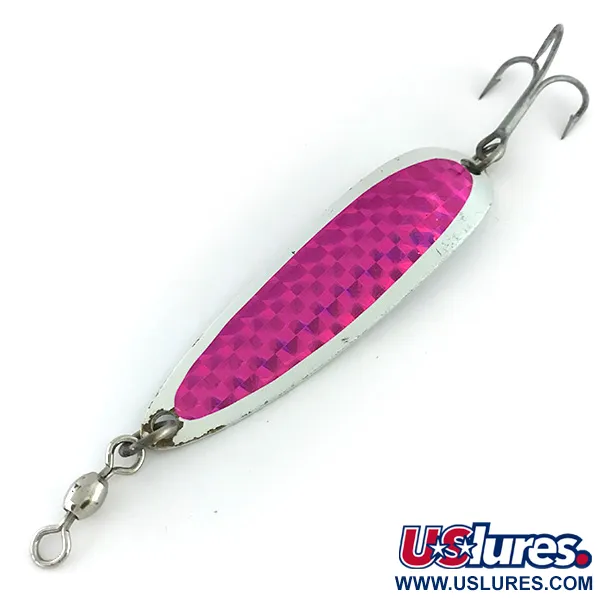 Detta kraftiga skeddrag i metall mäter hela 3 1/4 tum (8,5 cm) och har en iögonfallande rosa prismatejp över en reflekterande kromkropp. Denna Luhr Jensen Krocodile Die #5, identifierad med produktkod 8508, väger 1 oz (25 g), en viktklass speciellt utformad för att hjälpa sportfiskare att nå djupt stående fisk eller göra långdistanskast från pirar och vågbrytare. Baksidan av skeddraget är tydligt stämplat med märkets klassiska logotyper, "KROCODILE" och "LUHR JENSEN", tillsammans med dess amerikanska ursprung. Både den toppmonterade lekaren och den bakre trekroken är säkrade med robusta fjäderringar, vilket bibehåller den styrka som krävs för större laxfiskar. Prismamönstret på detta exemplar ger ett facetterat, flervägs ljusspel som kontrasterar mot det polerade kolet på dragets ytterkant. Detta bete är i utmärkt skick med betyget 5/5. Den stämplade texten på baksidan är djup och läsbar, en detalj som samlare uppskattar hos dessa klassiska skeddrag.