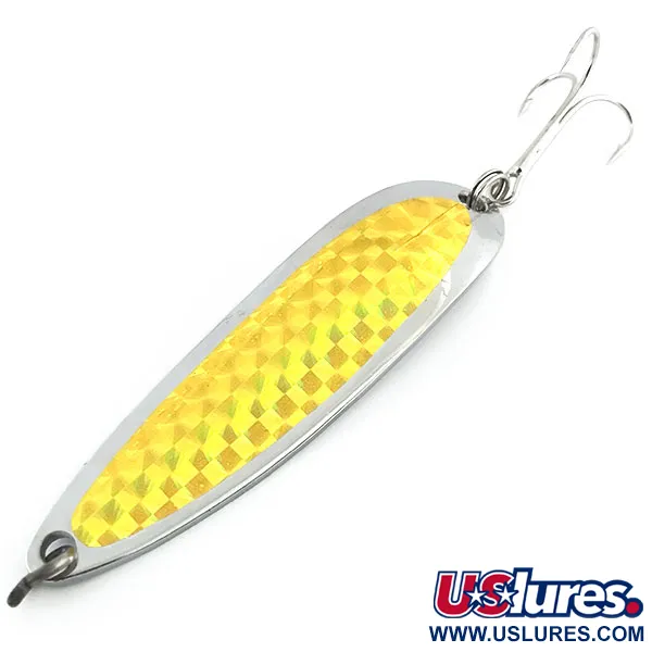 Med en vikt på 1 oz (28 g) är detta klassiska skeddrag för kast och trolling en stapelvara för de som siktar på djupt vatten där distans är avgörande. Kroppen på 3 1/4" (8,5 cm) har en finish i Nickel / Guldhologram, som använder ett geometriskt prismamönster för att fånga och reflektera ljus. Tydligt stämplad på den konkava sidan med Luhr Jensen Hood River, Oregon-märkning, visar detta specifika exemplar, produktkod 8766, den kraftiga metallkonstruktion som märket är känt för. Sportfiskare förlitar sig ofta på denna design för dess förmåga att klyva vinden vid långdistanskast från land. Komponenterna inkluderar en hållbar fjäderring i nosen och en stark trekrok i stjärten. I 5/5-skick förblir de reflekterande ytorna och den guldtonade fjälltejpen skarpa och välbevarade.