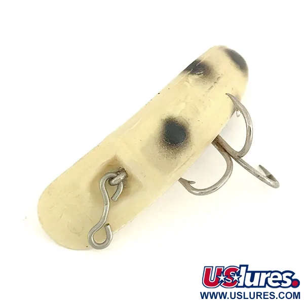 Detta 4,5 cm (1 3/4") långa bete i det klassiska vit/svart-prickiga mönstret representerar den mindre storleken i en legendarisk betesserie. Med en vikt på nätta 2,3 g (3/32 oz) är detta exemplar utformat för finesse-fiske efter arter som öring, abborre och steelhead. Luhr Jensen, ett namn synonymt med fisket i Pacific Northwest, tillverkade denna specifika Kwikfish K5 (produktkod 7809) i USA. Det är en flytande modell med ett djupgående på 1,2 m - 1,8 m (4 ft - 6 ft), vilket gör den mångsidig för både spinnfiske och lätt trolling. Tittar man på detaljerna är buktreblekroken fäst via en standardögla, medan nospartiet har den karaktäristiska S-formade tråden för lininfästning, ett signum för Kwikfish bananformade kropp. Skicket är 5/5, med en ren finish och välvårdade metallkomponenter som passar perfekt för fiske efter lax, gädda och för lättutrustningsentusiaster.