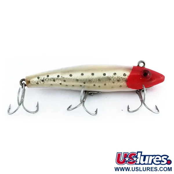 Denna klassiska sjunkande wobbler mäter 9 cm (3 1/2") och är utförd i det distinkta Color 11-mönstret. Designen har ett iögonfallande rött huvud parat med en guldskalig kropp med mörka prickar, en kombination som ofta väljs för fiske efter gädda, lax eller gös. Med en vikt på 14 g (1/2 oz) är TT 11-modellen byggd för mångsidigt fiske vid både spinnfiske och trolling, och täcker effektivt olika djup. På den vita buken nära den bakre kroken är "TT 11"-stämpeln tydligt synlig. Detta USA-tillverkade exemplar har skicket 4/5 och uppvisar lätta märken på guldfinishen och det röda huvudet som vittnar om dess historia. Under produktkod 9835 speglar detta L&S Bait Mirro-bete hantverket från Florida från mitten av seklet, komplett med röda originalögon och tre silverfärgade trekrokar. Den sjunkande konstruktionen tillåter sportfiskaren att fiska av olika delar av vattenpelaren beroende på hemtagning.