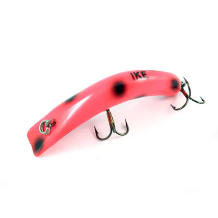 Livfulla röda och svarta prickar pryder den kurvade profilen på detta klassiska 7,5 cm (3 tum) drag. Detta USA-tillverkade exemplar från Lazy Ike-serien väger 6,5 g (1/4 oz) och har en tydlig "IKE"-stämpel på ryggens övre del nära stjärten. Den neonfärgade kroppen accentueras av flera mörka fläckar längs sidorna, ett mönster med hög synlighet som ofta väljs för fiske efter lax, öring och gädda under varierande ljusförhållanden. Draget är konstruerat för att nå djup mellan 1,5 m (5 ft) och 3,5 m (11,5 ft) och är ett mångsidigt val för både kastfiske och trolling. Komponenterna är i toppskick, med två vassa trekrokar och en ren fjäderring i metall vid fästögat. Draget är katalogiserat under produktkod 2575 och finishen är välbevarad över hela den bananformade kroppen, vilket motsvarar ett skick på 5/5. Undersidan visar en fortsättning av det prickiga mönstret, vilket bibehåller den visuella kontinuiteten över hela dragets yta.