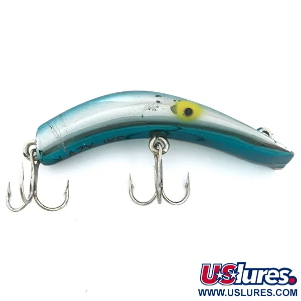 I en slående finish av Light Blue Metallic över Mirror Silver visar detta exemplar på 14 g (1/2 oz) upp den klassiska bananformade profilen som blev en stapelvara i fiskelådor över hela USA. Med en längd på 8,5 cm (3 1/4") bär betet det stämplade namnet "LAZY IKE" tydligt över magen, vilket samlare ofta söker efter som ett tecken på äkta tillverkning. Denna modell, listad under produktkod 6739, är en flytande modell avsedd för grunt vatten mellan 0,3–0,6 m (1–2 fot). Finishen är exceptionellt välbevarad och har fått 5/5 i skickbetyg, där den spegelsilverfärgade magen ger betydande blänk. Den är utrustad med två skarpa trekrokar säkrade med robusta ringar. De gulmålade ögonen med tydliga svarta pupiller sitter framträdande nära fronten och ger karaktär åt den metalliska kroppen. Designad för både spinnfiske och trolling efter gös eller gädda, speglar betets konstruktion den hållbarhet som är typisk för amerikanska fiskeredskap från mitten av århundradet. Kroppens ovansida övergår i en ljusblå nyans som kontrasterar rent mot de silverfärgade sidorna.