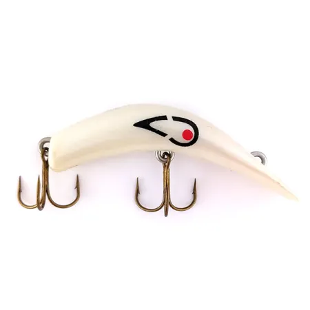 Denna vintage-wobbler från USA är 6 cm (2 1/4") lång och har en distinkt böjd profil i färgen White Pearl. Detta exemplar, identifierat med produktkod 9990, har den igenkännbara svart-röda stiliserade ögongrafiken tryckt på sidan. Med en vikt på 6 g (3/16 oz) är den bananformade kroppen framtagen för fiske i grunda vatten mellan 0,3 m och 0,6 m (1 ft och 2 ft) djup. Två bronsfärgade trekrokar är i toppskick, vilket matchar wobblerns yttre betyg på 5/5. Linfästet är infällt i den övre delen av den sluttande fronten, en design som passar för både spinnfiske och trolling efter arter som gädda och gös. Pärlemorglansen har kvar sin ursprungliga lyster över hela plastkroppen.