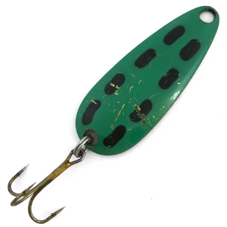 Stämplat tydligt på den mässingstonade baksidan identifierar märket "LEN THOMPSON NO. 0" denna kanadensiska skatt. Skeddraget är 6,5 cm (2 1/2") långt och har en klassisk grön framsida prydd med tydliga svarta prickar och guldfläckar som efterliknar naturliga bytesdjur. Med en vikt på 17 g (3/5 oz) är dess design fokuserad på en långsamt vaggande gång som har gjort det till en klassiker för gädda och kanadaröding i årtionden. Detta specifika exemplar, med produktkod 6765, är i 4/5-skick och visar välbevarad färg på den konvexa sidan och en ren guldfinish på den konkava insidan. Monteringen inkluderar en robust fjäderring och en vintage trekrok som är strukturellt intakt. Sedan 1929 har Len Thompson prioriterat balansen i detta skeddrag, vilket gör det till ett pålitligt val för spinnfiske eller trolling under olika sötvattensförhållanden.