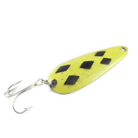 Fem svarta diamanter i det klassiska mönstret över en livlig gul finish definierar estetiken hos detta kanadensiska skeddrag. Med en vikt på 3/4 oz (21 g) och en längd på 2 3/4" (7 cm) ger denna modell i storlek #1 en rejäl profil för fiske efter gädda eller kanadaröding. Baksidan i mässingsfinish bär tillverkarens stämplade namn, Len Thompson, vars produktion i regionen sträcker sig tillbaka till 1929. Detta exemplar, med produktkod 1748, visar lätta tecken på användning i färg och metall men är i 4/5 skick. En silverfärgad trekrok är fäst baktill via en stark fjäderring, vilket gör det redo för både spinnfiske och trolling. Den specifika kurvaturen i metallen är konstruerad för att skapa en långsam vaggande gång vid invevning. Mässingsbasen är synlig på baksidan och ger en subtil blänk-effekt som kontrast till den högvisuella gula framsidan.