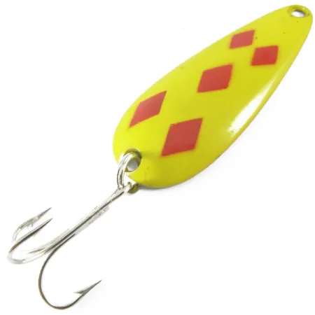 Den massiva mässingskonstruktionen på 21 g (3/4 oz) gör denna 7 cm (2 3/4") långa Len Thompson #1 till en tungviktsfavorit för fiske efter gädda och kanadaröding. „Five of Diamonds“-finishen är skickligt applicerad med fem skarpa röda diamanter mot en livlig gul bakgrund. På baksidan finns den klassiska tillverkarstämpeln pressad in i den rena mässingsytan. Detta exemplar, identifierat med produktkod 3682, är i 5/5 skick med högblank lack och en ljus lyster i metallen. Sedan 1929 har dessa kanadensiska skeddrag varit kända för sin långsamt vaggande gång som imiterar en skadad betesfisk vid kast eller trolling. Draget är utrustat med en robust trekrok, säkert fäst i stjärten för att klara huggen från kraftfulla rovfiskar.