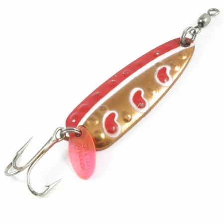 Kopparplätering med stämplade gropar på baksidan framhäver det traditionella hantverket i kanadensisk dragtillverkning. Med en vikt på 25g (1oz) och en längd på 7cm (2 3/4") har denna Len Thompson #13 ett tydligt röd-vitt droppmönster över en polerad kopparkropp. Detta specifika föremål, identifierat med produktkod 3287, är i skick 5/5 med en blank finish och välbevarad färg. Utrustningen inkluderar en robust trekrok åtföljd av en genomskinlig rosa lockbricka och ett kraftigt tunnhvirvel i den främre fjäderringen. På den konkava insidan är tillverkarens logotyp tydligt stämplad i metallen mitt i en texturerad yta. Detta skeddrag är designat för mångsidighet och används ofta för spinnfiske eller trolling efter gädda, lax och kanadaröding.
