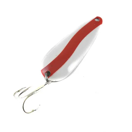 Med en vikt på hela 28g (1oz) känns detta skeddrag gediget i handen, ett kännetecken för den kanadensiska kvalitetstillverkning som Len Thompson har upprätthållit sedan 1929. Skeddraget mäter 8cm (3 1/4") i längd och har det högkontrastiva färgmönstret Röd / Vit, en finish designad för maximal synlighet under varierande vattenförhållanden. På baksidan syns den pressade mässingen, en egenskap som ger den specifika densitet som krävs för att nå djupare ner i vattenpelaren vid trolling eller kastfiske. Detta exemplar, identifierat med produktkod 0739, har ett skickbetyg på 4/5 och behåller sin levande emalj med endast obetydliga spår av sin tid i en samlares fiskelåda. Komponenterna är fortsatt robusta med en kraftig trekrok fäst via en stark fjäderring, redo för fiske efter gädda, lax eller kanadaröding. Varje kurva i mässingskroppen är konstruerad för att efterlikna siluetten av en betesfisk samtidigt som den balans som sportfiskare har förlitat sig på i nästan ett sekel bibehålls.