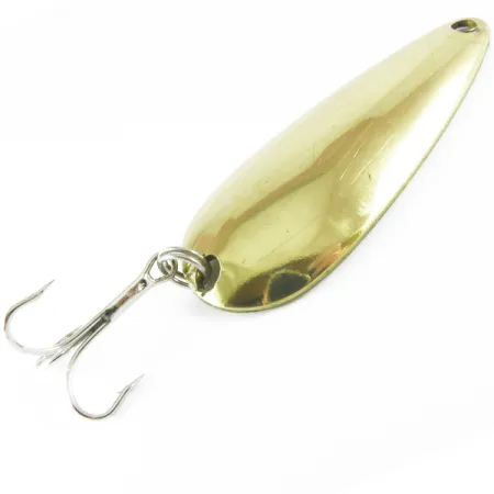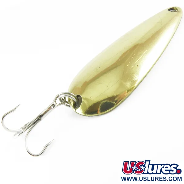 Präglat med den ikoniska 'LEN THOMPSON NO. 2'-märkningen på den konkava sidan, bär detta tunga skeddrag i mässing arvet från en kanadensisk design som etablerades redan 1929. Med en solid vikt på 28 g (1 oz) ger metallkroppen den nödvändiga massan för långdistanskast eller för att hålla djupet vid trolling. Den 8 cm (3 1/4") långa kroppen har en ytfinish i högblankt guld som täcker hela den droppformade ytan, avsedd att imitera blänket från en flyende betesfisk. Modellen med produktkod 3680 är utrustad med en hållbar fjäderring och en silverfärgad trekrok. Designen är historiskt känd för att ge en långsam wobbling-gång, en egenskap som förblir standard för gädd- och kanadarödingfiskare. Detta specifika drag är i 5/5-skick och uppvisar en briljant, reflekterande yta fri från repor eller oxidering. Den övre öglan är välformad, vilket säkerställer en smidig fästpunkt för din tafs eller ditt beteslås.