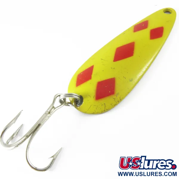 Fem röda diamanter är skarpt målade över ett ljusgult fält på denna kanadensiskillverkade klassiker. Med en vikt på 28 g (1 oz) har detta specifika skeddrag (produktkod 3681) den traditionella mässingsfärgade baksidan som samlare letar efter i tidiga Len Thompson #2-modeller. Sedan varumärkets start 1929 har dessa drag byggts för att efterlikna profilen hos en liten småfisk, och detta 8 cm (3 1/4") långa exemplar har den tydliga stämplade texten på baksidan. Utrustad med en silverfärgad trekrok är draget ett måste för dem som kastar eller trollar efter gädda och kanadaröding. Färgmönstret Five of Diamonds är utan tvekan det mest kända i katalogen, avsett att ge hög synlighet under olika vattenförhållanden. Med ett skick betygssatt till 4/5 uppvisar den gula färgen några spridda repor och lätt slitage från användning, även om den strukturella integriteten i metallen och hårdvaran förblir utmärkt. Skeden är konstruerad för en långsamt vaggande gång, en teknisk egenskap som har förblivit en konstant för tillverkaren i nästan ett sekel.