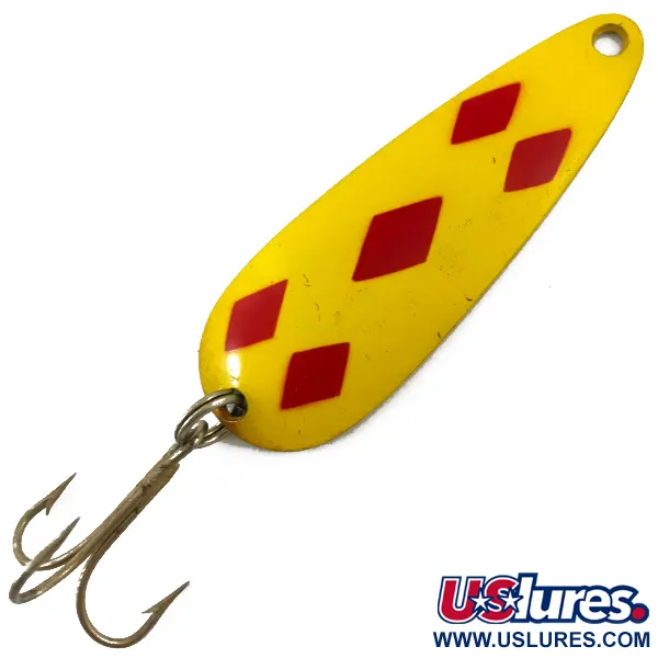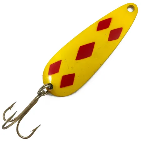 Fem tydliga röda rutor mot en klargul finish utmärker en design som har varit ett måste i fiskelådor ända sedan företaget startade sin produktion 1929. Med en vikt på 28 g (1 oz) är denna Len Thompson #2 (produktkod 4653) konstruerad med en tjocklek som stödjer dess karakteristiska långsamma vaggande gång vid invevning. Baksidan av skeddraget har en tydlig stämpel som identifierar det som en "LEN THOMPSON NO. 2", vilket visar den mässingsfärgade basmetallen undertill. I ett skick som bedömts till 5/5 är färgen fortfarande skarp och hårdvaran, inklusive den ursprungliga trekroken, är välbevarad. Detta exemplar på 8 cm är ett bevis på varumärkets rykte för balans, vilket gör det till ett pålitligt val för spinnfiske eller trolling i djupare vatten där lax och steelhead ofta uppehåller sig.