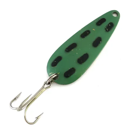 Med en livlig grön finish och sju tydliga svarta avlånga fläckar är detta skeddrag en klassisk representation av kanadensiskt hantverk. Len Thompson #2 mäter 8 cm (3 1/4") och väger 28 g (1 oz). Den är byggd på en tung mässingsstomme som ger betydande kastlängd och hållbarhet. Vänd på draget för att se den blanka mässingsytan, där tillverkarens namn och modellnummer är tydligt stämplade i metallen. Bland gädd- och kanadarödingfiskare är den känd för sin karakteristiska långsamt vaggande gång. Detta exemplar, med produktkod 8107, är i toppskick (5/5) utan synligt slitage på färg eller hårdvara. Den kraftiga trekroken är fäst via en robust fjäderring, typiskt för den kvalitet man förväntar sig av ett varumärke som tillverkat drag sedan 1929. Den övre öglan är redo för ett beteslås eller tafs och bibehåller den balans som gjort dessa skeddrag välkända över hela Nordamerika.