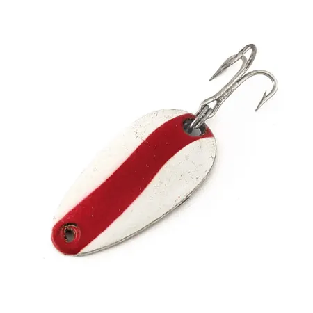 En diagonal röd rand ger en skarp kontrast mot den vit emaljerade framsidan på denna kanadensiska klassiker. Detta specifika Len Thompson #6 skeddrag, listat under produktkod 11190, speglar en designfilosofi som i stort sett förblivit oförändrad sedan märket grundades 1929. Mässingskroppen på 1" (2,5 cm) är tydligt stämplad på baksidan med tillverkarens namn och modellstorlek, vilket visar upp den polerade metallfinishen. Med en vikt på 1/8 oz (3,5 g) är draget konstruerat för spinnfiske eller trolling, designat för att efterlikna profilen av en liten betesfisk. Komponenterna är i utmärkt skick, med en robust trekrok och fjäderring. Med ett skickbetyg på 5/5 är emaljen välbevarad och mässingen behåller sin ursprungliga glans. Dess gång är centrerad kring en långsam vaggande rörelse, ett tekniskt drag känt för att utlösa hugg från kanadaröding och gädda.