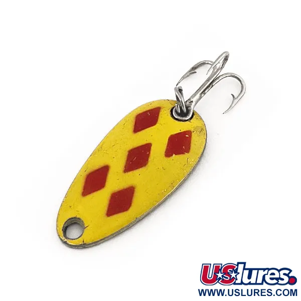 En kompakt ram på 1" (2,5 cm) bär den omisskännliga gulröda Five of Diamonds-finishen på denna kanadensiska klassiker. Med en vikt på 1/8 oz (3,5 g) är Len Thompson #6 designad med den balans som har definierat varumärket sedan 1929. Baksidan har tillverkarens autentiska märke stämplat direkt i metallen, vilket identifierar modellnumret och dess arv. Detta exemplar, med produktkod 11269, behåller sin ursprungliga lyster i den gula emaljen och de fem röda diamantaccenterna. Sportfiskare förlitar sig ofta på dessa skeddrag för en långsamt vaggande gång som efterliknar små betesfiskar vid kastfiske, trolling eller jiggfiske efter öring och gädda. Komponenterna består av en robust trekrok säkrad med en fjäderring. Varje aspekt av detta bete speglar de tillverkningsstandarder som etablerades i Kanada för nästan ett sekel sedan. Exemplarets skick är klassat som 5/5, där både färg och metall är mycket välbevarade.
