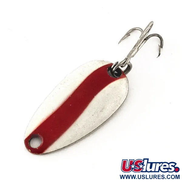 Tydligt stämplat på den mässingsfärgade baksidan finns markeringen 'LEN THOMPSON NO. 6', vilket identifierar detta lilla skeddrags ursprung. Detta kanadensisktillverkade bete, med produktkod 11312, har en klassisk vit finish med en tydlig diagonal röd rand över framsidan. Skeddraget mäter exakt 2,5 cm (1") i längd, väger lätta 3,5 g (1/8 oz) och är byggt på en bas av solid mässing. Komponenterna består av en enkel silverfärgad trekrok monterad i den bredare änden med en robust fjäderring. Skicket är graderat till 5/5, och emalj- och metallytorna framstår som välskötta och rena. Historiskt sett är dessa skeddrag balanserade för en långsamt vaggande gång, en teknik som sportfiskare använt för att efterlikna små betesfiskar ända sedan märket grundades 1929. Ett linhål är snyggt stansat i dragets smala främre ände.