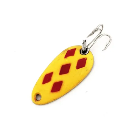 Direkt stämplad på den mässingsfärgade baksidan finns märkningen "LEN THOMPSON NO. 6", som identifierar detta kanadensiska skeddrag. Med en kompakt längd på 2,5 cm (1") och en vikt på 3,5 g (1/8 oz) bär det det mycket igenkännliga Five of Diamonds-mönstret, bestående av fem röda diamanter tryckta över en gul grundfärg. Dragets skick är exceptionellt, med en välbevarad finish och blank metall på baksidan, vilket ger betyget 5/5. Listad under produktkod 11369, har detta drag en silverfinishad trekrok fäst via en fjäderring, lämplig för spinnfiske eller lätt trolling efter öring och abborrfiskar. Droppformen och den tjocka mässingskroppen har varit ett kännetecken för Len Thompson sedan 1929, vilket ger en balanserad gång i vattnet. Färgen på framsidan är skarp och livfull, vilket kontrasterar mot den polerade mässingsundersidan.
