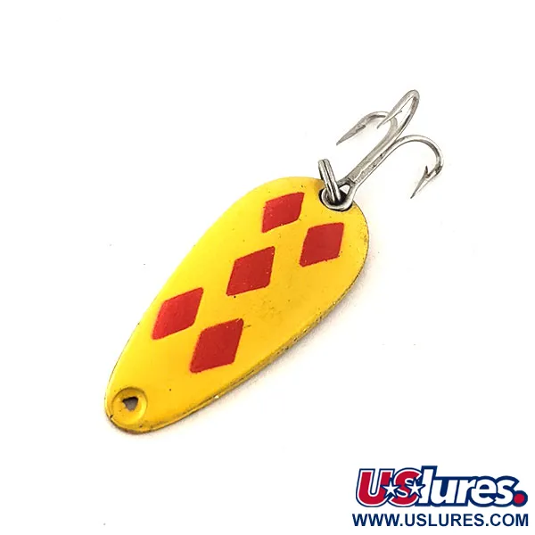 Fem röda ruter är skarpt schablonerade mot en klargul emalj, vilket skapar det ikoniska "Five of Diamonds"-mönstret som har gjort dessa kanadensiska skeddrag berömda sedan 1929. Detta exemplar är en Len Thompson #7, som mäter 3,4 cm (1 1/4") och väger 5 g (3/16 oz). Baksidan har en blank mässingsfinish, djupt stämplad med tillverkarens märke "LEN THOMPSON No.7" för att intyga dess äkta ursprung. Draget är utformat för olika tekniker, inklusive spinnfiske och trolling, och är utrustat med en ren, silverfärgad trekrok fäst via en robust fjäderring. Registrerad under produktkod 11533, är skeden i 5/5 skick och har en jämn yta med färg i hög kontrast. Den kompakta profilen är särskilt viktad för att efterlikna små betesfiskar i vattenmassan.