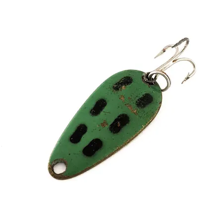 Detta kanadensiska skeddrag på 3,5 cm (1 1/2") har ett livligt grodmönster med en gräsgrön ovansida och distinkta svarta ovala fläckar. På den mässingsfärgade undersidan finns den tydliga stämpeln "LEN THOMPSON NO 7", vilket vittnar om arvet från en tillverkare som har funnits i fiskelådorna sedan 1929. Med en vikt på 5 g (3/16 oz) är skeden konstruerad för en långsamt vaggande gång som efterliknar en liten betesfisk. Den silverfärgade trekroken sitter fast med en pålitlig fjäderring, och det allmänna skicket är fina 4/5 med lätta spår av användning. Listad under produktkod 11545, är droppformen och mässingsbasen klassiska drag för Len Thompsons sortiment.