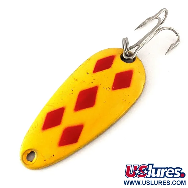 Fem tydliga röda diamanter sticker ut mot den klargula emaljen på detta kanadensiska bete. Med en längd på 4 cm (1 1/2") och en vikt på 7 g (1/4 oz) är storlek #8 en stapelvara för sportfiskare som jagar olika sötvattensarter genom spinnfiske eller trolling. Baksidan uppvisar en ren mässingsfinish med den tydligt synliga stämpeln "LEN THOMPSON NO. 8", ett signum för det tillverkningsarv som startade 1929. Detta exemplar med produktkod 12340 är i 5/5-skick, med en slät yta och skarpa färgkonturer. Skeddraget är riggat med en silverfärgad trekrok och fjäderring. Dessa mässingsbaserade skeddrag är historiskt kända för sin långsamt vaggande gång. Den främre öglan är ren, vilket möjliggör en enkel anslutning till ett beteslås eller lina.